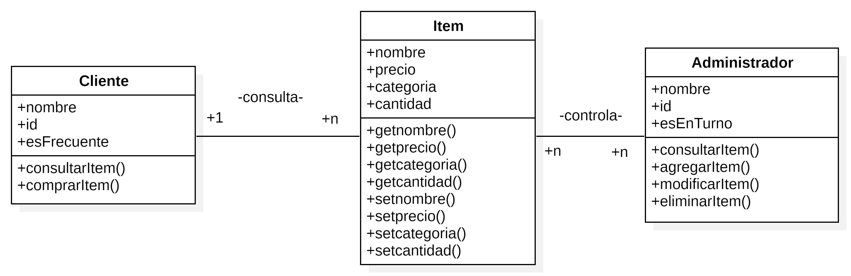 En este diagrama se presenta las relaciones de asociación disponibles entre las clases cliente, administrador e Item. En este se encuentran relaciones 1 a n y n a n.