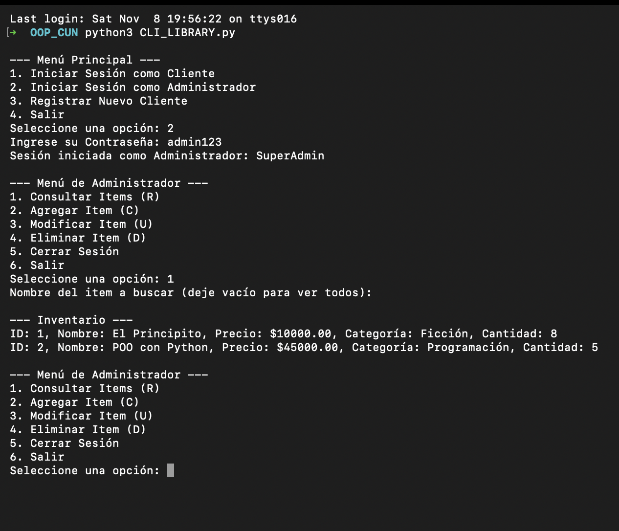 class Libreria: def __init__(self): self.gestor = basededatos() self.usuario_actual = None self.datosejemplo() def datosejemplo(self): self.gestor.inicializar_administrador() self.gestor.agregar_item('El Principito', 15000, 'Ficción', 10) self.gestor.agregar_item('POO con Python', 45000, 'Programación', 5) # Inicializa un cliente de prueba self.gestor.crearcliente('Sergio') def menu(self): if isinstance(self.usuario_actual, Administrador): print("\n--- Menú de Administrador ---") print("1. Consultar Items (R)") print("2. Agregar Item (C)") print("3. Modificar Item (U)") print("4. Eliminar Item (D)") print("5. Cerrar Sesión") print("6. Salir") return input("Seleccione una opción: ") elif isinstance(self.usuario_actual, Cliente): print("\n--- Menú de Cliente ---") print("1. Consultar Items") print("2. Comprar Item") print("3. Cerrar Sesión") print("4. Salir") return input("Seleccione una opción: ") else: print("\n--- Menú Principal ---") print("1. Iniciar Sesión como Cliente") print("2. Iniciar Sesión como Administrador") print("3. Registrar Nuevo Cliente") print("4. Salir") return input("Seleccione una opción: ")Para finalizar, se crean las estructuras de control para gestionar las entradas del usuario.